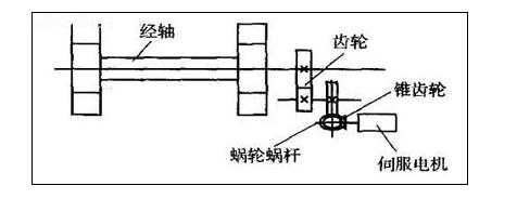 控制电路以PLC为核心,或以单片机代替。下面主要介绍一下和伺服系统密切相关的电子送经与电子卷取机构。电子送经机构由张力信号采集系统、信号处理和控制系统、织轴驱动装置三部分组成。装在双后梁上的压力传感器检测经面张力,PLC在平棕时检测张力反馈信号,信号经PLC内部处理后控制我们的伺服系统,伺服电机通过蜗轮蜗杆传动至织轴上,控制送经速度,从而实现恒张力的自动控制,保证织轴由大变小的过程中保持张力均匀。下图为电子送经机构示意图。