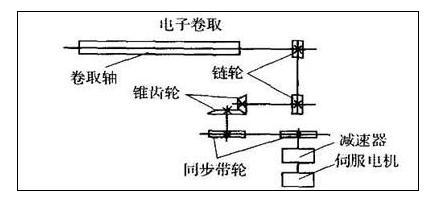 电子卷取是根据织物要求的纬密,通过触摸屏输入织物纬密,有PLC控制伺服系统实现织物定量定速的卷取。采用伺服电机做动力,电机通过减速箱,由同步带传动到卷取传动轴,通过锥齿变向后,带动刺毛辊转动,对包覆在辊上的织物进行卷取,下图为电子卷取机构示意图。