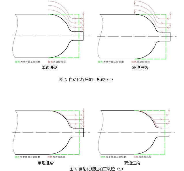 (1)轨迹设计。第一种自动化旋压加工轨迹如图3所示。第二种自动化旋压加工轨迹如图4所示。采用第一种进给方式优点是编程简单,工件表面光洁度好,但是容易导致工件变粗或拉断,因此采用第二种进给方式。