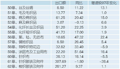 2008年1—7月纺织品服装出口情况(单位:亿美元,%)