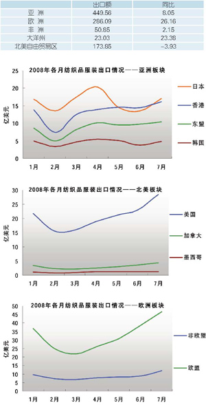 2008年1—7月纺织品服装出口市场情况(单位:亿美元,%)
