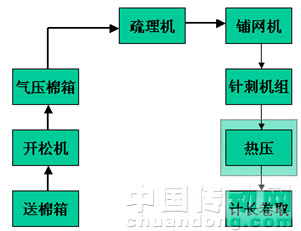 无纺布的纺织工程学名叫做非织造布。非织造布工艺完全不同于传统的纺纱——织布过程,非织造布的最大特点是不需要纺纱过程,它的“织布”过程更加类似于造纸工艺,非织造布通常是在一条生产线上直接实现从纤维到成布的连续加工过程。非织造布生产线“吃”进去的是纤维,“吐”出来的是布。参见图1针刺型无纺布工艺过程,定向或随机排列的纤维通过摩擦、抱合、粘合或这些方法的组合,而相互结合制成的水平缠结薄片、纤维网或絮垫,经过针刺机组在垂直布面方向缠结成布。因为没有传统意义的纺纱织布过程,所以叫做无纺布。