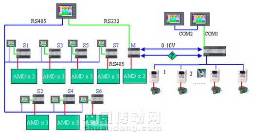 台达的驱动器、控制器及人机界面等产品均带有RS485接口,采用通讯方式安装方便、价格低廉,故在规划整条生产线的控制方式时可以充分利用通讯的方便性。故可以拟出以下两种方式:图2方式,PLC与人机联线使用RS232,模拟量传递速度信号(考虑到通讯有实时性问题),变频器频率由PLC通讯给定,功能端子给定命令。图3方式,PLC与人机联线使用RS485, 模拟量传递速度信号,变频器频率由人机COM3通讯给定,功能端子给定命令。两者相比差异在于变频器控制源上。虽然效果一样,但图3方式远远增强了人机与PLC的通讯距离,亦即对本系统来说人机安放的范围将很宽,更适合生产线上分布安装,故将本系统按照图3设计。