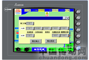操作界面主要实现对针刺、进料、出料、剥网、托网及机台间通讯进行监控操作。单机界面设计分五部分:启动画面,主画面,参数设定画面,手动操作画面,配方画面和帮助画面。在设计用户界面之前,须根据控制方案设计模组参数相关内容,一是控制器选择和控制区设定:控制器使用DELTA CONTROLLER ASCII,控制区长度设为8;二是通讯方式和通讯口设定,DOP-AE提供一个RS232口和两个RS485口(或一个RS422口),设计时只要在模组参数设定的通讯项分别指定两个RS485口的指向和通讯格式即可。这两步完成才有下面的深入设计。