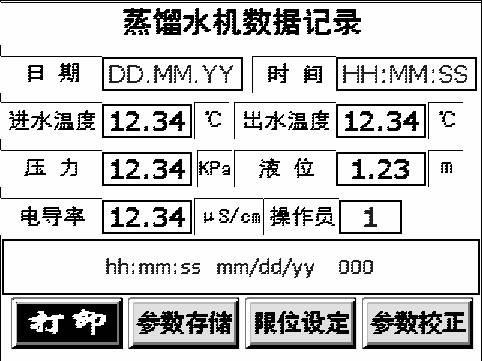 蒸馏水机控制系统主要实现控制被控原料罐内部温度、压力以及电导率等物理量满足不同产品规格要求。控制系统可以根据不同产品需要设定相关参数,同时设置参数上下限,并实时显示相关参数数值变化,控制各个管道阀门开度,从而保证产品按照预设工艺参数生产,超限时会有报警显示和相关保护动作。同时根据客户需要,产品加工完成后打印参数报表和存储参数报表(电子文件格式*.JPG存储在通用USB磁盘内)。