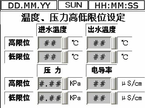 按下图4参数存储按钮后,该画面就以YY-MM-DD-画面编号.JPG文件格式存储在U盘中,文件名以日期+画面序号命名,如果U盘未插在人机背面,会显示未找到存储盘报警。按下图4的“限位设定”按钮,画面跳转到温度、压力高低限位设定画面,如图5所示。通过数值输入按钮输入不同参数数值,满足不同产品规格使用。