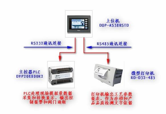 (2)系统通讯原理设计:COM1:RS232通讯方式与下位PLC连接,进行蒸馏水设备和产品各项工艺参数设置和读取。COM2:RS485通讯方式与微型打印机连接,利用台达HMI宏指令编程功能,处理自由口通讯协议,发送给打印机需要打印的汉字、英文字母以及数字等,可以进行产品工艺参数报表打印,作为产品品质检测的文字依据以及存档保存数据。
