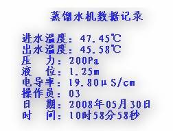 灵活运用人机界面提供的宏指令功能可以达到事半功倍的效果,上面的程序是一个应用例子,实现了不同权限级别多用户登陆控制系统,给产品设计开发技术人员提供了灵活编程应用的强大功能。蒸馏水机参数数据画面如图4所示。