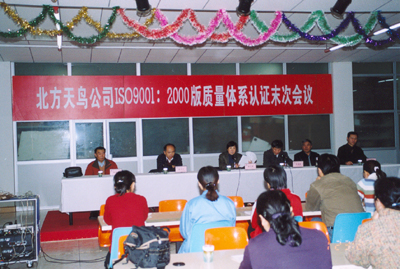 2003年11月29日~12月1日,中国新时代质量认证中心派审核专家对天鸟公司进行了为期三天的ISO9001:2000质量管理体系现场审核。本次认证审核专家组以寇玉珍高级审核员为组长,组员有屈广达(高级审核员)、阮平之(审核员)、林勇军(实习审核员),共9个人日,审核工作量之大创我公司迎审历史之最。