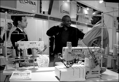 图为中国标准缝纫机集团公司的参展商正在与南非参观者交流