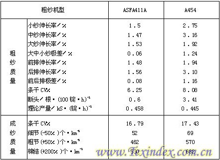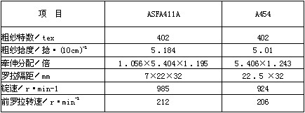 将ASFA411A型与A454型粗纱机对比,在配棉成分相同,清、梳、并、细机型和工艺条件相同情况下,用ASFA411A型和A454型粗纱机分别纺制粗纱,再用这两种粗纱在细纱机上纺成C 18.2tex纱。测试粗纱、细纱质量,并进行对比。