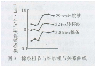 图3中的试验条件:熟条号数58KTEX,环锭细纱20英支,转杯纱18英支,可试验长度为10万米粗节疵点数,熟条疵点为粗节个数/千米,在图3曲线中可看出环锭纱,转杯纱粗节疵点的分部基本与熟条疵点的分部状况相类似。