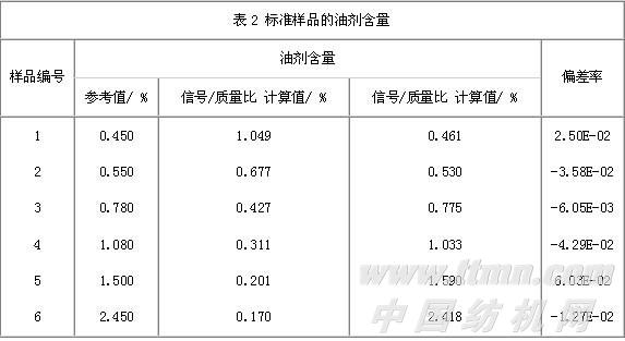图1 和表2 的结果显示样品的油剂含量与核磁共振信号密切相关,油剂含量百分比可以在估计标准差0.049的范围内预测出来,其回归曲线的相关系数达0.996。