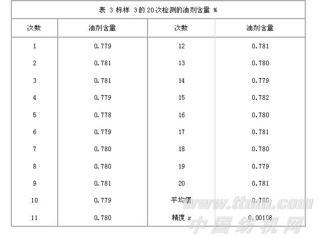 为确定检测方法的精度,可用一个中值样品(标样3)对应于图1的标定曲线进行20次检测。此样品应在26 ℃下进行至少30 min的检测前恒温,然后将样品插入探头进行重复检测,每次检测的时间间隔为30 s。检测结果见表3。