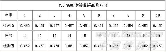 在室温(15℃)下将1号样品放入探头进行20次连续检测(样品不取出),间隔时间90 s。由于探头内温度为40 ℃。样品温度会从15 ℃缓慢上升到40 ℃。检测值记录见表5。可见检测值随温度的升高会有轻微漂移。