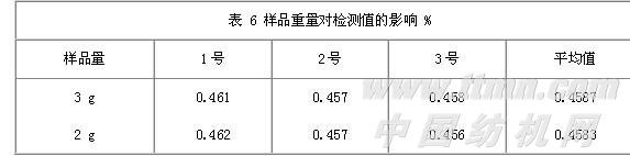 将3 g样品放入试管,连续测量3次后,取出部分纤维,余下2 g纤维,在室温下静置3 min后再测量3次。检测值记录见表 6 。