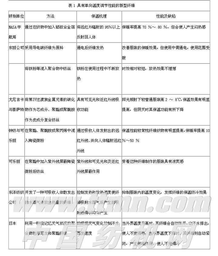 以下所说的伪相变纤维,其实是指具有温度调节作用,但方向是单一的而不是双向的。这些纤维[3,4] 所具有的温度调节功能都是单一的,或升高或降低,如果合理使用可以得到良好的效果。但这些纤维也存在明显的缺点,即由于只具有单向温度调节作用,所以当环境温度变化方向与其温度调节方向相反时往往不能很好地发挥其效能,甚至效果正是人们所不希望的。