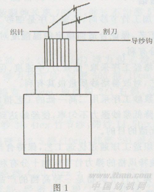 羽毛纱的工艺主要由针织和割绒组成,即“一针一刀”,形成单针织成的芯线和中段被芯线握持并且两头被割刀切断形成一定长度的毛羽饰纱。在内转式小针筒上安装一枚织针和一枚割刀,由两个导纱钩分别引入两根纱线,一根做芯纱,一根做饰纱。芯纱通过上面的导纱钩引入,饰纱通过下面的导纱钩引入(如图1所示)。当针筒在转动时两根纱线同时喂人织针并在织针上成圈形成圈套。同时下面的饰纱被割刀钩住成一个大的圈圈。当下一个回转时,芯纱、饰纱都被织针钩住成圈而割刀钩住饰纱并在割刀下降的过程中割断前一次成的圈。被割断的纱由于有芯纱成的圈把它给固定住了,不会脱落,这样就在芯纱的周围形成了羽毛。