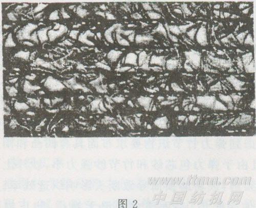 羽毛纱可用各种纤维纱线生产,常用的是粘胶、腈纶、锦纶和涤纶。构成羽毛纱的主干部分是芯纱,其原料性能必须符合针织用纱的要求。饰纱是羽毛纱的表现部分,决定成纱的感观效果。饰纱纤维要求光泽好,有弹性,能自然竖立;并且强力不宜过高,易于切割,不易掉毛。我们选用了强力比较大的化纤长丝为芯纱,强力小的羊毛合股线为饰纱。纺成的羽毛纱如图2。