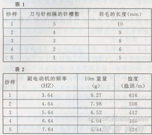 我们用10m纱的重量来表示毛羽的密度。我们测试了用相同原料,相同主电动机速度,相同针与刀相隔的针数,不同副电动机速度下10m羽毛纱的重量和捻度(见表2,主电动机的频率均为24.5HZ)。从表中我们可知在相同的针筒转速下(即主电动机频率相同),随输出罗拉速度(即副电动机频率相同)的增大其羽毛密度逐渐减小。因此要想使羽毛密度大,其中的一个方法就是要使输出罗拉速度减小,但是减小量是有限的。因为速度太慢时旧线圈脱不了钩,纺不成纱。增加羽毛密度的另一个方法是用多根细单纱作饰纱,则羽毛既密又蓬松柔软,手感很好。
