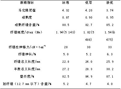 注 : 1.用FMT仪测试马克隆尼值:3.0 ~ 3.9为细, 4.0 ~ 4.9为平均,5.0以上为较粗。 成熟度:1.0很成熟, 0.95 ~ 1.0 高于平均成熟,0.85 ~ 0.95 适宜纺纱。