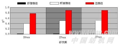 近年来,AFIS由兹路韦基•乌斯特进行实验改进,它能测定纤维棉结。纤维棉结包括两种类型的棉结:机械棉结和籽屑棉结。后者导致了影响用UT-3测量的在+200%范围内常发性疵点(IPI)值。图3显示,用UT-3测量的纱支数为Ne30(20tex)、Ne22(27tex)、Ne16(37tex),在+200%常发疵点与棉结总粒数/克、纤维棉结粒数/克和籽屑棉结粒数/克之间的相关系数r2,只有籽屑棉结在这个试验中认为有高度相关。由于籽屑棉结的原因,多数+200%常发性疵点被UT-3记录到,这尤其符合相当于纱线支数变细(直径减少)棉结增多。