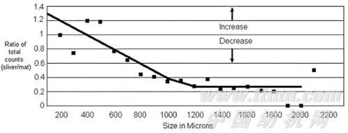 图5显示说明在籽屑棉结尺寸分布上清除的结果。在这里,绘制了条子中籽屑棉结与原料中籽屑棉结的比率。从500μm到2000μm的棉结清除约70%。可是对于小尺寸范围的棉结,它呈现的那个比率是在增加,在小尺寸上的籽屑棉结粒数也可能增加。这符合理论上梳棉中大量籽屑被打碎成小籽屑的趋势,小的籽屑棉结的清除是困难的。