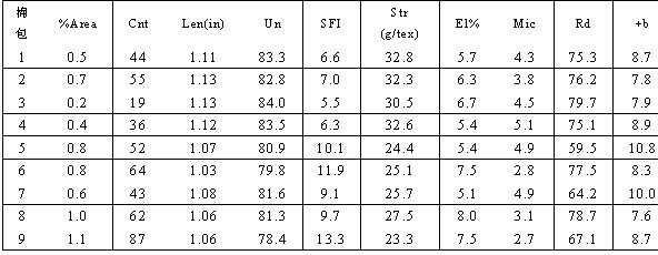 9包陆地棉和比马棉,首先在USTER HVI(HVI 900)上试验,依次获得每包棉花的质量特性参数(看表6)。这些棉包,马克隆值的范围从2.7到4.9;断裂强度从23.3到32.8g/tex,长度从1.03英寸(27mm)到1.13英寸(28.7mm)。