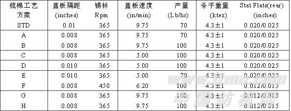 每包棉在两种梳棉速度下梳理:100磅/小时(45千克/小时)和120磅/小时(54.4千克/小时)。每包棉在两种盖板速度(5英寸/分钟和9.75英寸/分钟)下梳理。最后每包棉在三种不同的盖板隔距(盖板到主锡林):0.08、0.01和0.014英寸下梳理每种工艺生产4.3ktex的条子,在条子上研究籽屑棉结和传统的纤维棉结(表7)。