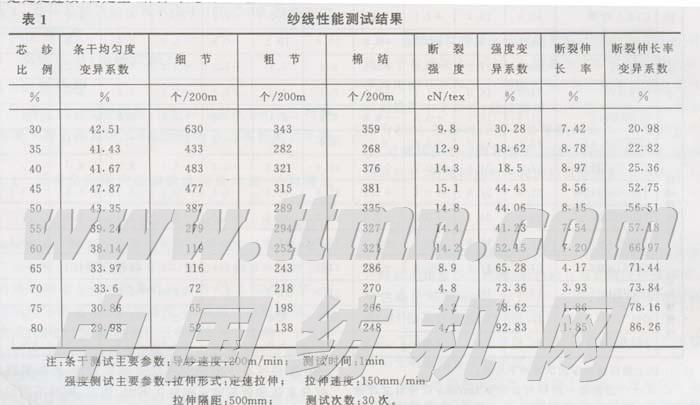 实验在芯纱比例30%~80%之间取1l组数据,摩擦辊转速为3500r/min,纺纱速度为150m/min,在DREF一Ⅲ型摩擦纺纱机上纺制59.1tex包芯纱,测定其主要性能并进行分析。