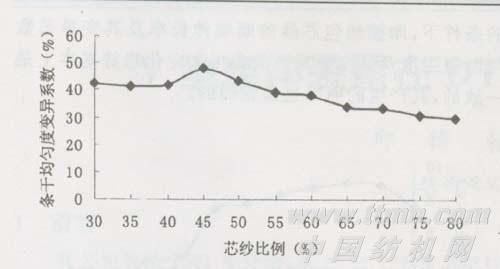 分析:从图中可以看出,芯纱比例在30~40%之间时,条干均匀度变异系数随着芯纱比例的增加变化