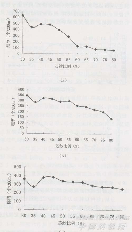 4.2 芯纱比例对细节、粗节和棉结数的影响(图2)