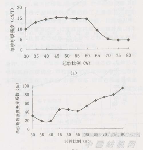 4.3 芯纱比例对单纱断裂强度及其变异系数的影响