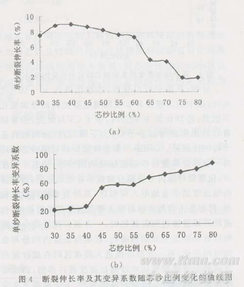 4.4 芯纱比例对断裂伸长率及其变异系数的影响