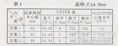 采用较小的后区中心距(43mm-45mm),但因上罗拉后移,中后罗拉的握持距仍保持在68—70mm,并且有14mm左右的粗纱紧贴在后下罗拉表面,大大加强了牵伸过程中对浮游纤维的有效控制,缩小了牵伸后区的非控区长度,以平衡须条的牵伸力,从而获得较理想的预牵伸,有利于降低成纱的牵伸力和条干不匀率(表1)。
