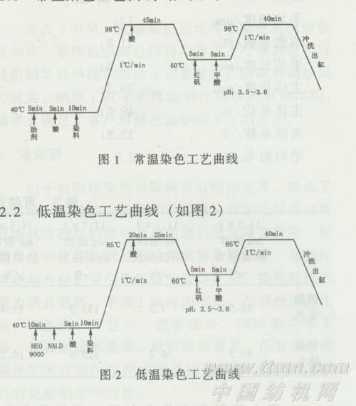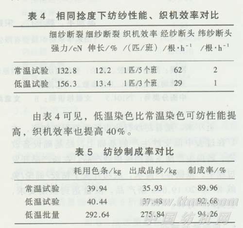 用GB250-1995评定变色用灰色样卡评定,低温染色的深度比常温染色深度高0.5~1级,染同一色号在深度、色光相同时,低温染色比常温染色可节省染料5%-10%,控制好色条含油率,低温染色在纺纱前纺和后纺都要比常温染色生活好做,而且前纺尘屑小,皮辊沾灰粉少。