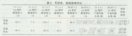 由表2可见,低温染色纱线断裂强力和断裂伸长高于常温染色,细纱断头降低,可纺性提高,织机效率提高25%。