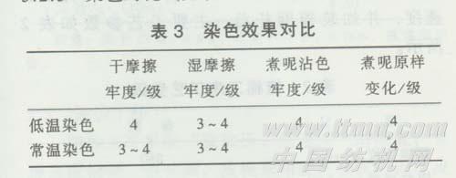 由表3可见,低温染色比常温染色摩擦牢度高半级,而且用比色卡比较低温染色比常温染色深度高1级,得色深、透。