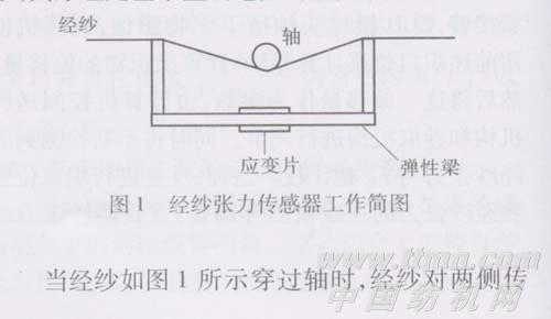 织机在织造过程中,经纱动态张力对织造的,顺利进行有着很大的影响,张力过大,易引起断头,影响织造效率;张力不足易造成梭口不清,形成三跳疵点,使布面及纹路不够清晰。测量数根经纱张力的经纱张力传感器工作简图如图1所示,其原理是基于金属电阻的应变效应。