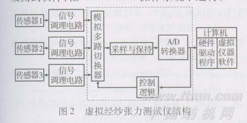 由于要测出经纱张力与主轴转角的关系,所以用了3个传感器。传感器1是经纱张力传感器,把经纱张力物理信号转化为电信号;传感器2是光电脉冲传感器,用来测量主轴转角;传感器3是霍尔传感器,将霍尔电压作为测量触发信号。各个传感器输出的信号都要经过一个信号调理电路对信号进行处理(如滤波、放大等),从混合信号中取出待测的有用信号,送人数据采集卡,并要适合数据采集卡的电压范围,通过总线结构送进计算机进行处理。