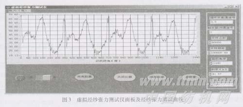虚拟经纱张力测试仪的面板结构如图3所示。面板右边的七个文本框输入内容,是用户根据实际测量的需求以及与采集卡的连接通道在开始测试前设定的。测量时,打开测试仪器开关,仪器就可以工作;按下采集数据,稍等几秒,面板上就会显示出经纱张力的波形图。保存数据就是对测量的原始数据、信号处理后的数据以及需要提供给用户的数据存取;读数据是读取事先已经测量的数据,然后在仪器面板上绘出曲线,这有利于事后分析;关闭仪器则退出测试状态。