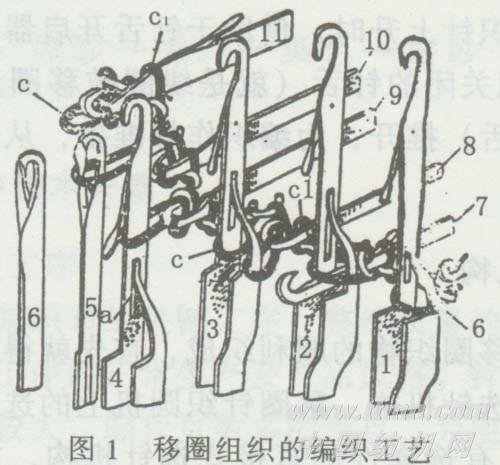 扩圈片是弯曲的弹簧钢片,其一段固装在针杆上,另一端紧贴针杆的凹槽a。圆纬机上有专供移圈用的三角座(即鞍座)与选针机构,把需要移圈的织针上升到高于退圈时所处的位置。这时候扩圈片穿人线圈中,把线圈扩展,并搁在片肩上,如图1中的织针1所示。接着针盘织针向外伸出,穿过针杆与扩圈片所组成的空间,如织针1和织针7所示。然后针盘织针向后移动(即向针筒中心移动),钩住处于针筒织针上的线圈c。针筒织针下降。见织针3和织针8。随着针筒织针下降,线圈c从针筒织针针杆与扩圈片之间缝隙a处滑出,见织针4。当针筒织针继续下降时,线圈c从针头上脱下,见织针5与织针6所示,并转移到针盘织针上,见织针11所示。