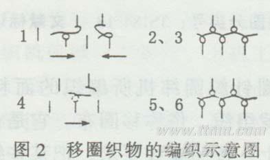 当织针到达下一成圈系统(路数)前,针筒织针上升,此时借助于针舌开针器,把关闭的针舌推开,为正常编织作好准备。图2就是移圈织物的编织示意图。