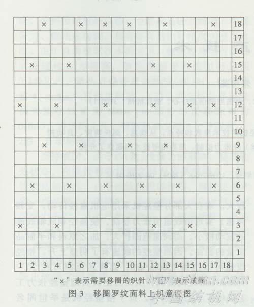 根据花纹图,排列花盘。首先在花盘其中一个槽片上作记号,然后以所做的记号为起始点,按照花纹图数槽数,遇到“X”,就排列一个钢米,直至把一只花盘数完;接着依次进行排列。当然,利用移圈罗纹机还可以编织菱形、折纹型、复合性等各种花型图案。