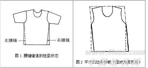 2.9.1 针对直向扭歪的方向,设计样板时,由矩形调整为向扭歪相反方向偏移的平行四边形可改善拷腰缝缝道的扭歪程度。用“Z”捻纱编织的单面布缝制的上衣,由于织物的扭曲变形,两边的腰缝缝道发生扭转,右边缝道扭在衣服的前面,左边缝道转到衣服的背面,即衣服下摆由右向左转移,呈现腰缝的扭歪(图1)。针对这种状况,在样板设计时,可预先考虑其扭歪的程度,把两道腰缝边由垂直线改为向扭歪相反方向偏移的斜线,即由传统的矩形状态改为平行四边形状态。当织物衣片发生变形时,其斜线逐渐变为直线,便可改善腰缝的扭歪程度(图2)。样板设计时,腰边的偏斜一般掌握在3 % ~ 5 %,偏斜太大会增加排料时的用料,而且会给下摆的卷边(折边)带来困难。