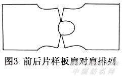 2.9.2 排料划样时,前后片样板采取相对排列,即在同一段布上的直向,样板为肩对肩或下摆对下摆排列(图3)。这样的排列,使裁成的前后两片衣片,织物的编织方向刚好相反。把这两片衣片配对缝制,由于前后片编织方向相反,存在相反的扭歪力,缝制成衣后,扭歪力便能相互抵消,减少了腰缝的扭歪程度。