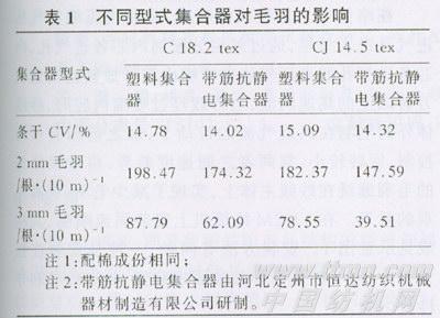 2.1.1 新型带筋抗静电细纱集合器对毛羽的影响