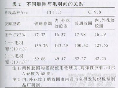 内、外花纹胶圈及普通胶圈与成纱毛羽间的关系见表2
