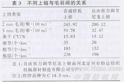 由表3可见,自由张力调节尼龙上销对减少毛羽、改善条干和降低千米节结效果十分显著。铁板上销由——只铁板张紧两只胶圈,在实际生产中很容易造成两只上胶圈张力的差异,从而引起摩擦力发生变化,产生滑溜现象,导致胶圈对纤维须条控制力减弱,使部分纤维失去控制,影响稳定牵仲,造成细纱条干恶化,毛羽增加,千米节结数量上升。而定州恒达生产的自由张力调节尼龙上销具有合理的工作角度(工作夹角为45度),能自动张紧上胶圈,减少了—亡胶圈的中凹和胶圈内周长差异带来的张力变化,有利刁:减少胶圈内层和上销板表面的摩擦,增强了上胶圈摩擦牵伸运行的稳定性,有利于握持控制纱条纤维的有序运动,起到了稳定变速的作用,能明显减少毛羽、改善条干和降低千米节结数量。