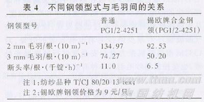 锡欧牌合金钢领是无锡锡荣纺织机械配件有限公司研制的。它具有运转平稳、同钢丝圈磨合性好、耐磨损、使用寿命长、抗热性能佳、表面硬度高及表面极度光滑等优点。其钢领工作面均衡光滑,具有一致的表面粗糙度和摩擦系数,有利于缩小纱锭之间的纺纱张力差异。同时,其表面附有一层极薄的自润滑层,使钢丝圈在润滑条件下运转,新钢领上车不需要走熟期。从表4中看出,使用合金钢领能降低断头、减少毛羽,降低成本。